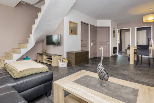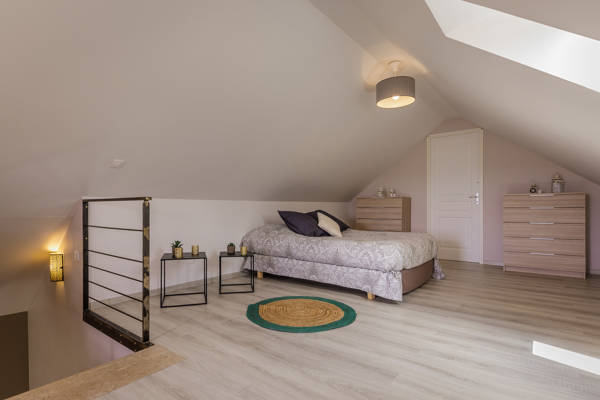 This holiday home has: 2 nice bedrooms, each with a two-persons bed and its own wardrobe, a bathroom (walk-in shower, vanity unit, hair dryer, etc.), a separate WC, a laundry room (washing machine, iron...), a fitted kitchen (microwave, oven, dishwasher,...) and a living room (sofa, coffee table, cabinet with TV...). Upstairs a nice space which can be used to retire during the day or to work remotely (there is a small desk). In this space there is also a day bed for 2 people and a baby bed.