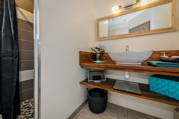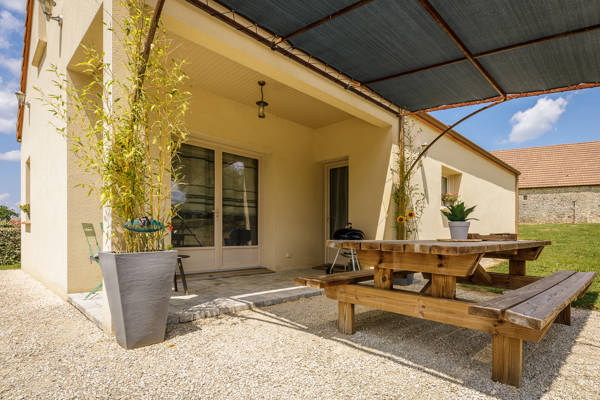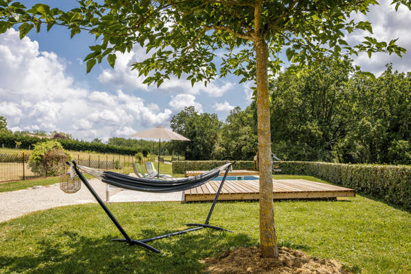 A real private swimming pool 6 x 3 (depth: 1.40 m) secured with its wooden terrasses which can be closed and opened. Sun loungers and a parasol, a drying rack and a dining area under a pergola with barbecue complete the exterior of this friendly house.