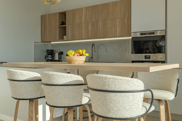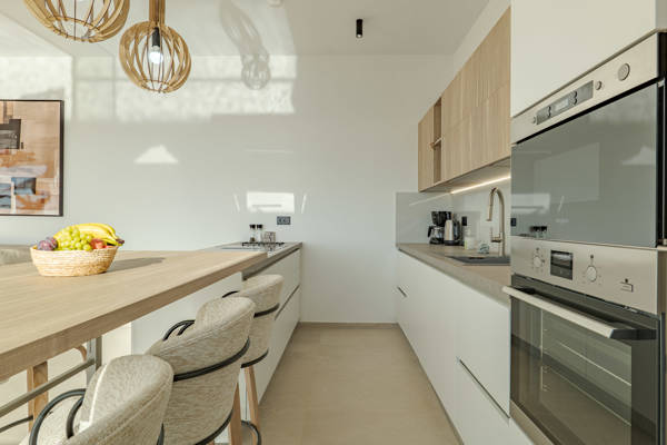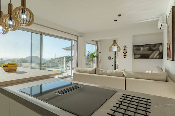 Un long couloir, avec toilettes supplémentaires et machine à laver, mène à un salon spacieux et lumineux. Les grandes baies vitrées offrent une vue panoramique et une transition fluide entre intérieur et extérieur. La cuisine moderne est équipée d’un îlot central avec hotte intégrée, parfaite pour cuisiner en toute convivialité. Un grand canapé d’angle assure des soirées confortables et détendues.
