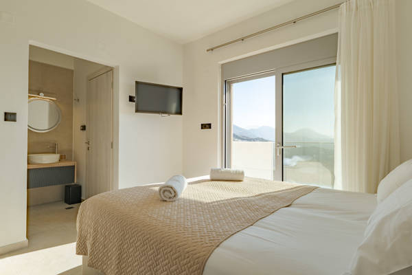 - Chambre 1 : au rez-de-chaussée, avec un lit double confortable, salle de bain attenante avec douche à l’italienne, lavabo et WC, ainsi que des portes coulissantes donnant sur une terrasse intime avec une vue spectaculaire.