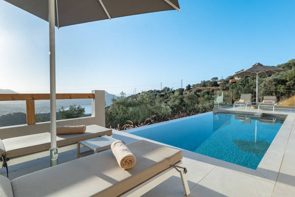 - Une piscine à débordement au centre, entourée de quatre chaises longues.