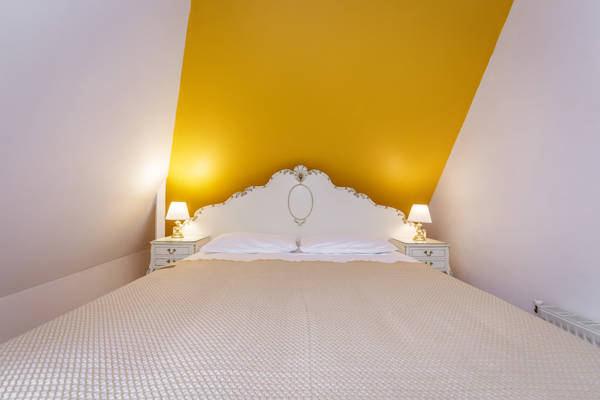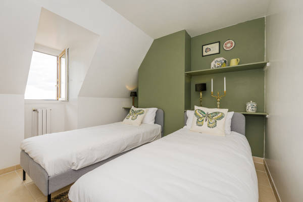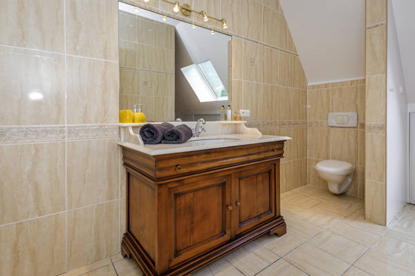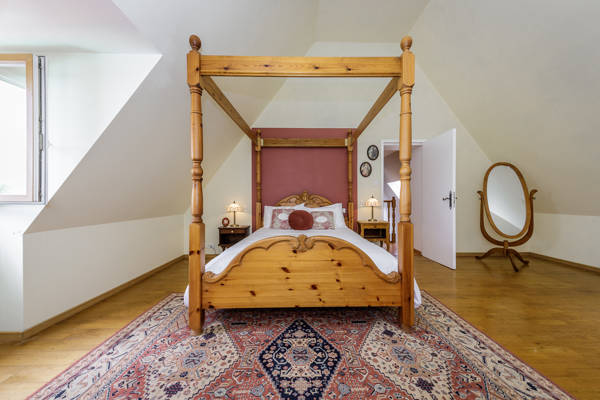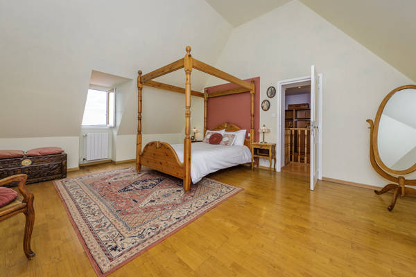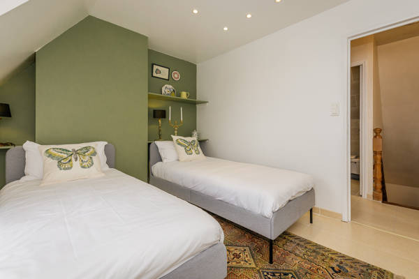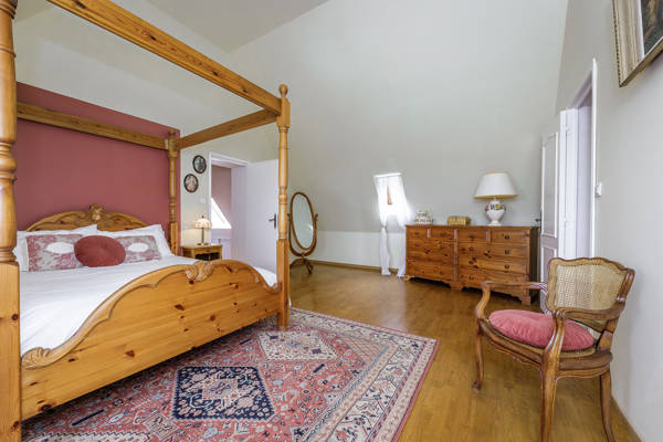 Chambres : Rez-de-chaussée : Chambre avec lit double – salle de bain en suite avec WC (3 petites marches à descendre) 1er Étage : 3 x chambres doubles, une chambre avec lit à baldaquin (160 m x 200 m) et un grand dressing et une salle de bain en-suite et les 2 autres chambres (une chambre 2 x 1 ps, une chambre avec un lit double) partagent une salle de bain commune.