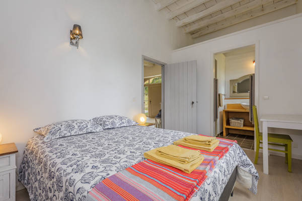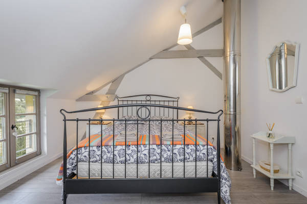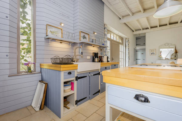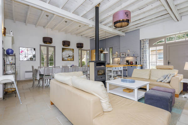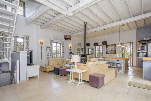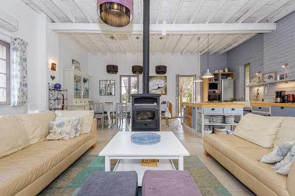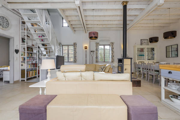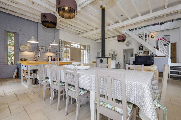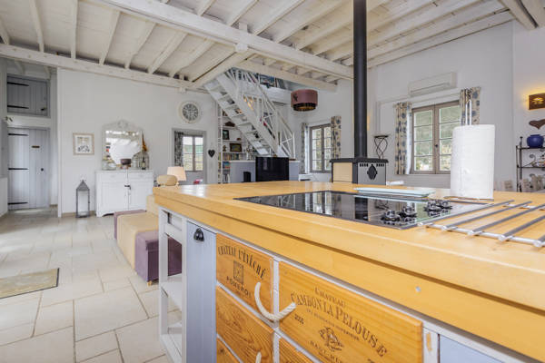 Vous entrez par la cuisine ouverte avec séjour, confortablement aménagée et aux couleurs claires. Au milieu de la pièce, entre la cuisine et le séjour, se trouve un poêle à bois. Merveilleux pour les soirées plus fraîches du printemps et de l’automne. La cuisine est entièrement équipée. Il y a climatisation au rez de chaussée.
