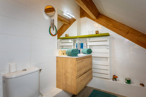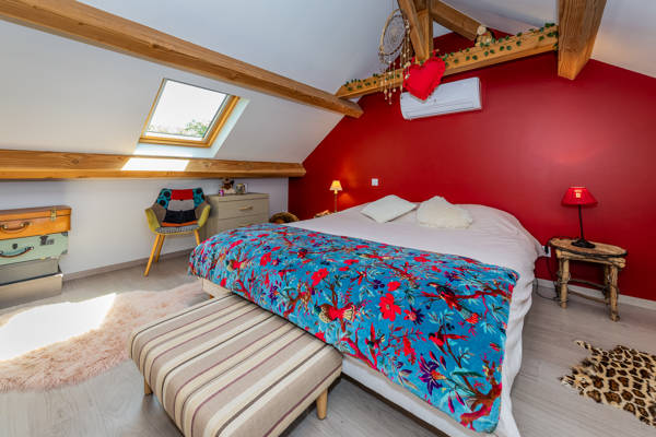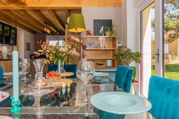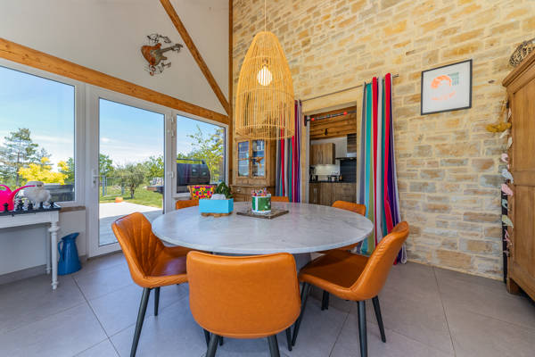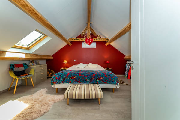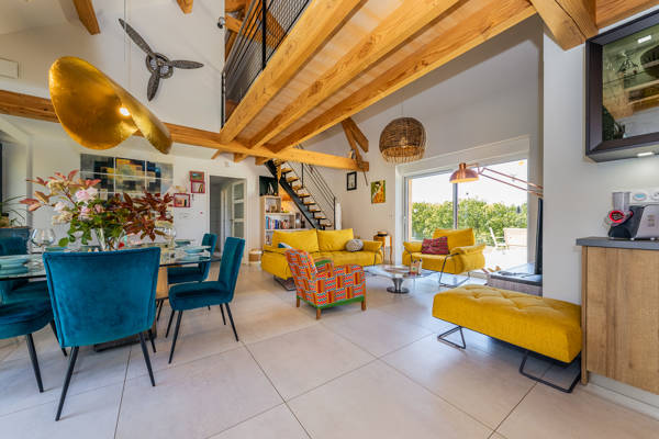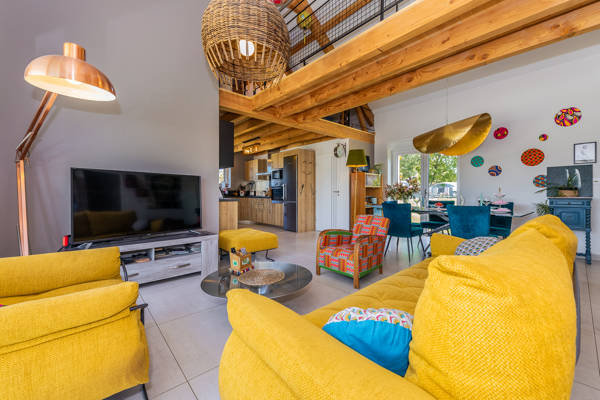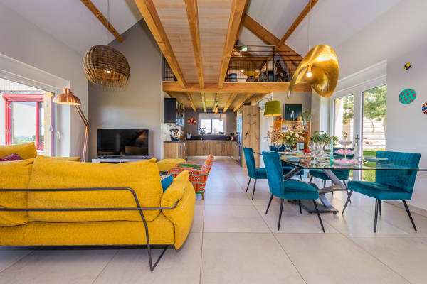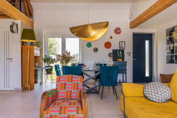 La décoration moderne aux accents colorés contraste avec charme les vieilles poutres et "Les Vieilles Pierres" à l'extérieur.