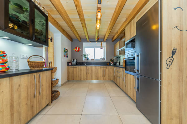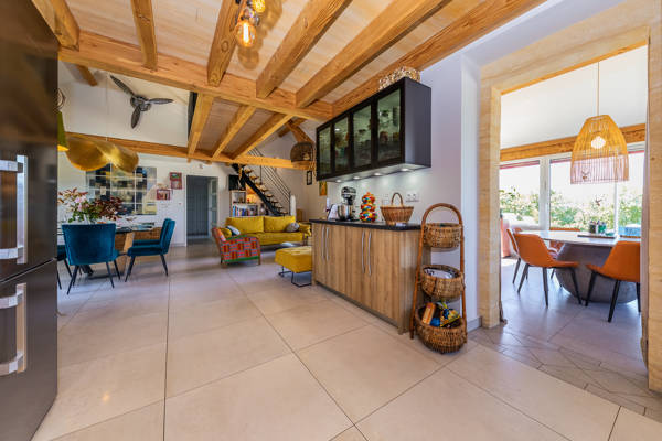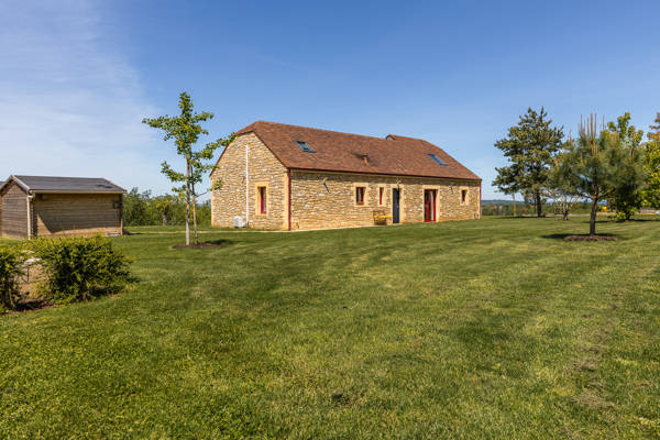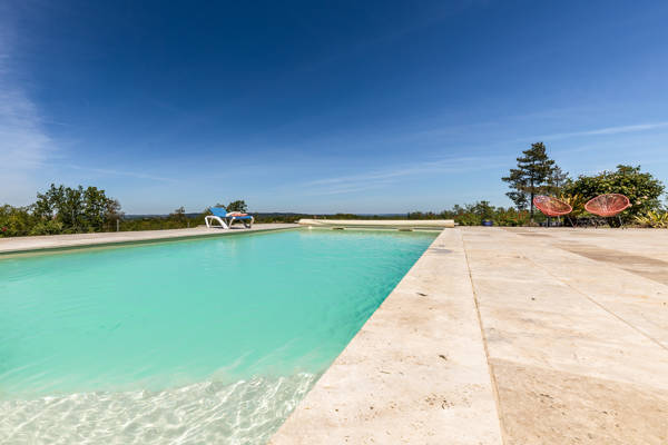 Cela crée une atmosphère décontractée. Le design et l'art (local) vont de pair dans cette maison ; belles décorations murales conçues par le propriétaire et mobilier design de Roche Bobois. De plus, la maison est décorée avec une touche d'humour, découvrez-la sur place ! Le décor coloré des quatre chambres crée une atmosphère ensoleillée et joyeuse. A côté de la cuisine se trouve un grand espace ouvert d'où vous avez une vue magnifique sur les truffières et les collines de la Dordogne/Lot. La cuisine vous offre tout pour préparer un délicieux repas français. De la cuisine, vous entrez dans le beau salon ouvert avec des canapés confortables et une chaise super relaxante et bien sûr une table à manger pour profiter d'un bon repas cette une fois que vous avez besoin de manger à l'intérieur… Au rez-de-chaussée 3 chambres avec lits doubles, à l'étage un espace détente et une autre chambre avec un lit double (il y a climatisation dans cette chambre). Salle de bain en bas et salle de bain en haut complètent l’interieur.
