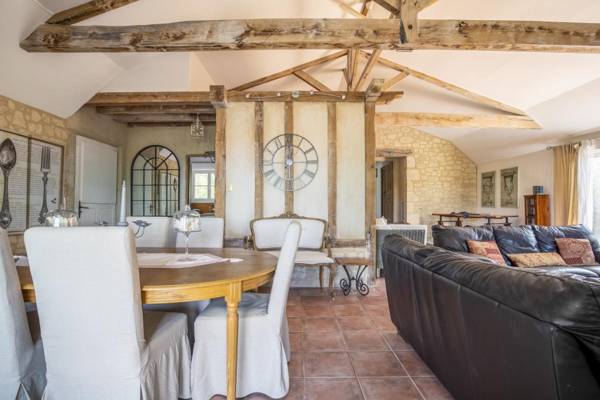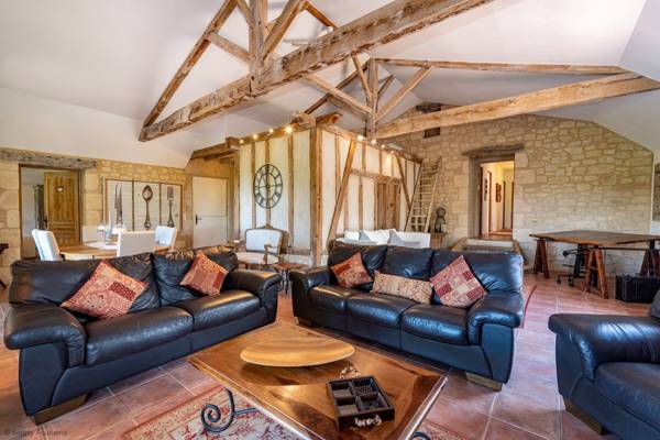 Le salon est spacieux et ouvert avec un plafond à double hauteur et de magnifiques poutres en bois. Il y a une grande salle à manger pouvant accueillir 8 personnes facilement et un salon avec de grands canapés et une télévision à écran plat.
