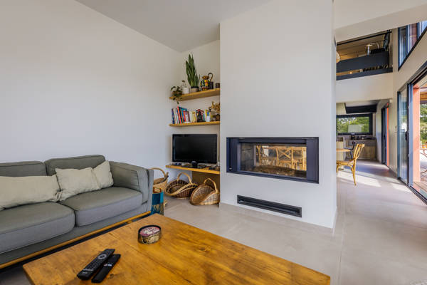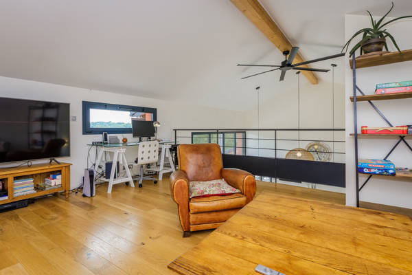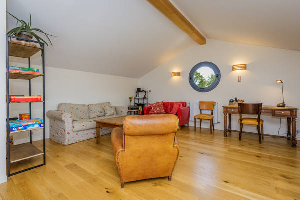 - Grote mezzanine met bedbank boven de woonkamer met slaapbank en TV ideaal voor de kinderen