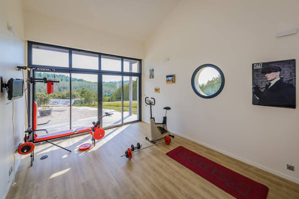 - Een fitnessruimte van 25 m² met hometrainer en halterbank.