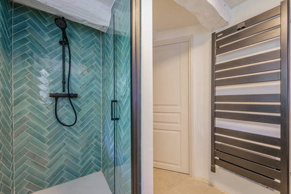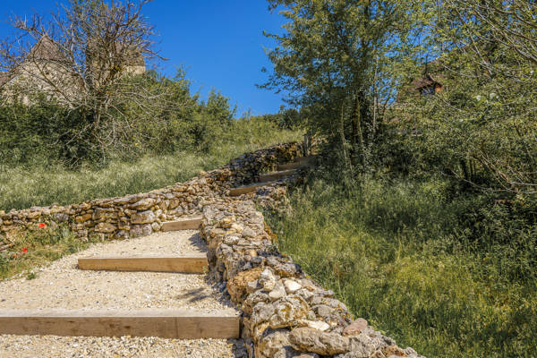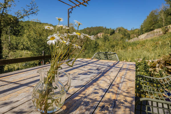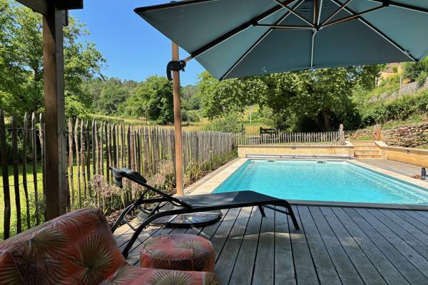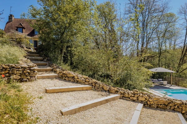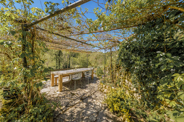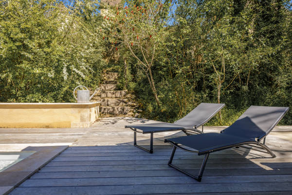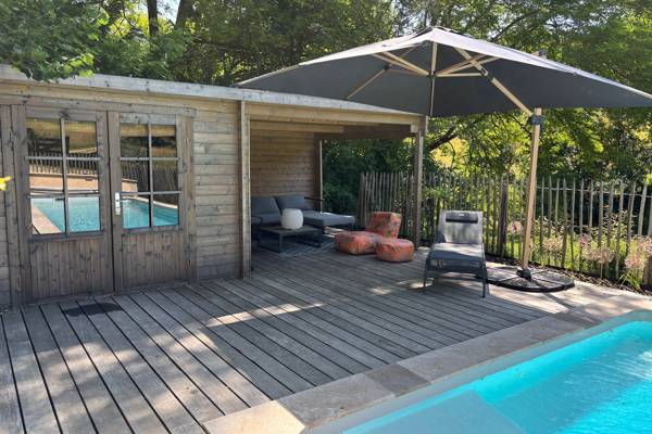 De tuin is speels aangelegd over drie niveaus en biedt op elk niveau een eigen sfeer. Op het eerste niveau staat een eettafel met prachtig uitzicht over de heuvels. Het tweede niveau beschikt over een terras met pingpongtafel en buitendouche. Op het onderste niveau vindt u het verwarmde privézwembad van 9 bij 4 meter en 150 centimeter diep, voorzien van een afdekking volgens de Franse veiligheidsnormen. Rond het zwembad staat een moderne loungeset onder een overkapping en ligbedden waar u heerlijk kunt ontspannen en genieten van een verfrissende duik. Daarnaast is er een groot grasveld, ideaal voor een spelletje voetbal of andere buitenactiviteiten. Een deel van de tuin is omheind, wat extra praktisch is wanneer de hond meekomt.